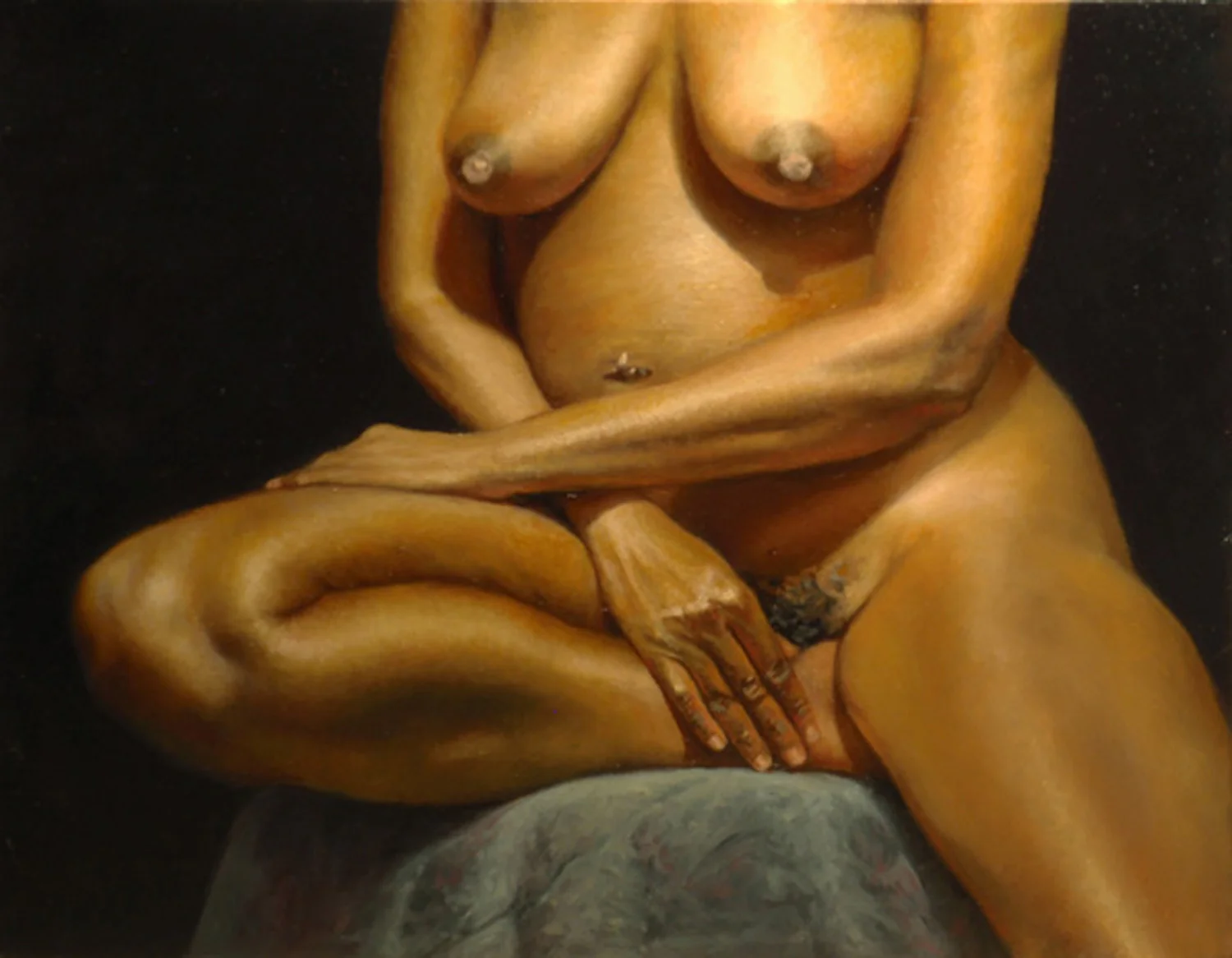 My favorite part of "The Navel Ring", is the hand that rests on the model's ankle. The sheen of highlights, the structural elements, the knuckle wrinkles and the warm reflected lights are delicious to portray. Note the amount of orange light on her fingers and on her lower abdomen just about her pubis. The similarity of texture of her pubic hair and of the crushed velveteen drapery satisfyingly contrast with the smoothness of her skin.